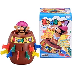 暇な時にひとりでもプレイできる「黒ひげ危機一髪」樽に入った黒ひげくん、剣を樽の穴に突き刺すとアタリにヒットすれば黒ひげくんが勢いよく飛び上がります。
