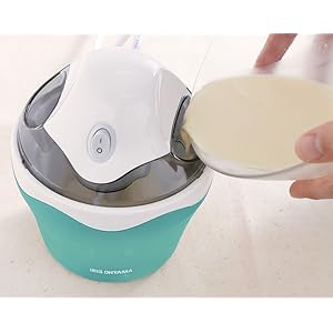 アイリスオーヤマのアイスクリームメーカーは冷凍庫であらかじめ冷やした保冷ポットを使い、材料を混ぜて入れるだけの簡単にアイスクリームがつくれる容量控えめな小さめサイズの商品です。